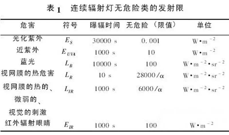 對(duì)于LED 的藍(lán)光輻射對(duì)視網(wǎng)膜的危害指標(biāo),可以參考以下表中參數(shù):