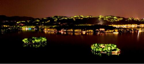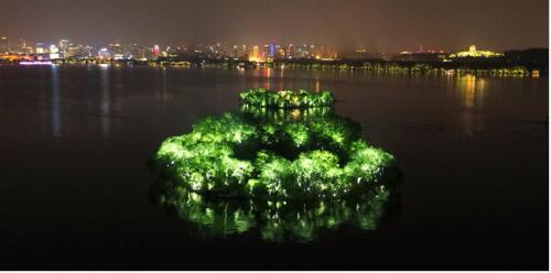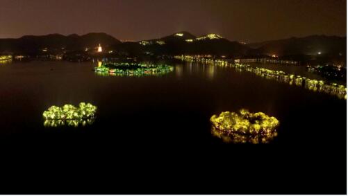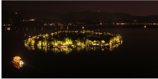湖心仙隱的小瀛洲、風(fēng)雅飄逸的湖心亭和“幽幽碧玉水中印” 的阮公墩。湖中三島的夜景觀與整個(gè)西湖的夜景觀完美融合,突出“水墨江南,湖城一體”的夜景特色。