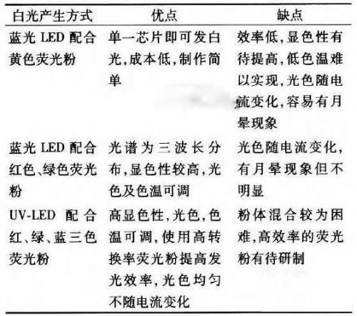 目前采用熒光粉產(chǎn)生白光共有三種方式:藍(lán)光LED配合黃色熒光粉;藍(lán)光LED配合紅色、綠色熒光粉;UV-LED配合紅、綠、藍(lán)三色熒光粉。其中商品化的 白光LED多屬藍(lán)光LED配合黃色熒光粉的單芯片型,藍(lán)光LED配合紅色、綠色熒光粉的白光產(chǎn)生方式只是在OSRAM、Lumileds等公司的專利上報 道過,但仍未有商品化產(chǎn)品出現(xiàn),而UV-LED配合三色熒光粉的方式目前也尚處于開發(fā)中。不同熒光粉產(chǎn)生白光LED的優(yōu)缺點(diǎn)比較見下表。