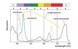首先,光質(zhì)。植物一般依靠葉片中的葉綠素吸收照射光,其吸收波段一般處于藍(lán)光和紅光區(qū)域,如圖1所示。吸收光在植物體內(nèi)經(jīng)光合作用轉(zhuǎn)換為有機(jī)能量,用以生長繁殖。因此,對于植物照明產(chǎn)品,首先應(yīng)考量其吸收波段的輻照度,一般為400nm~500nm藍(lán)光和600nm~700nm紅光波段的輻照度,以及需要確定所選組合植物照明的光譜組成、范圍、峰值波長和色溫等。